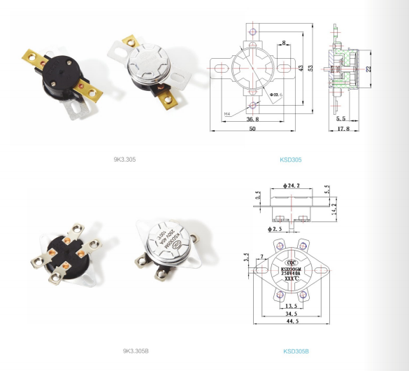 KSD305温控器是由双金属片感温突跳单刀单掷型温度控制器。该控制器由绝缘外壳🧏🏼‍♂️、金属盖🦹‍♀️、双金属片、触桥、弹簧、动作杆,构成的单极型的常闭开关。当温度变化升高达到双金属片预设变形温度时🤶🏻,双金属片动作通过动作杆使触桥与触点分离🏊‍♂️,使得原来呈常闭状态的开关断开。其断开温度可根据客户之需求而制作,动作后需手动复位使其闭合🪢。